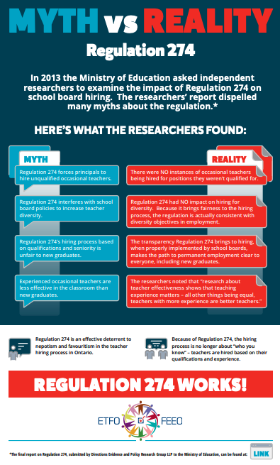 The report was published in November 2014 and indicated that Regulation 274, when implemented effectively by school boards, has resulted in a more consistent, transparent and fair hiring process for Ontario’s occasional teachers. The report also dispelled a number of inaccurate claims about the regulation.