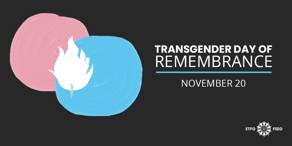 Each year, ETFO recognizes the International Transgender Day of Remembrance (TDOR). TDOR is observed annually on November 20. It is a day to remember transgender people, gender non-conforming individuals and those perceived to be transgender who have been murdered because of hate.