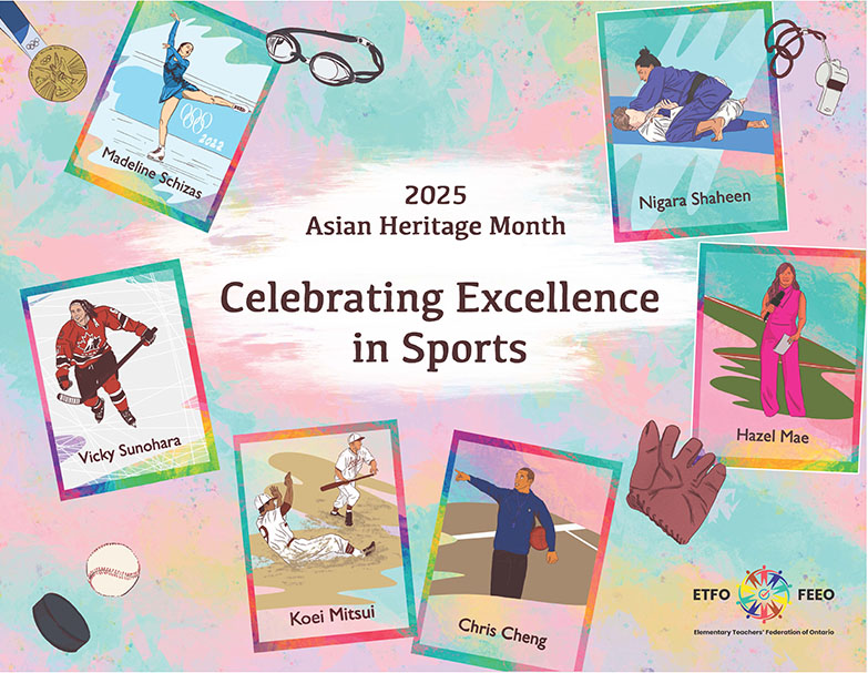 This year’s poster highlights Asian excellence in sports. When we think about sports, we usually focus on the athletes. While our poster does feature some outstanding athletes in baseball, swimming, skating, hockey, and judo, we also acknowledge those who work to coach, train, and document sport through a uniquely Asian lens. All of these trailblazers have connections to Ontario communities.