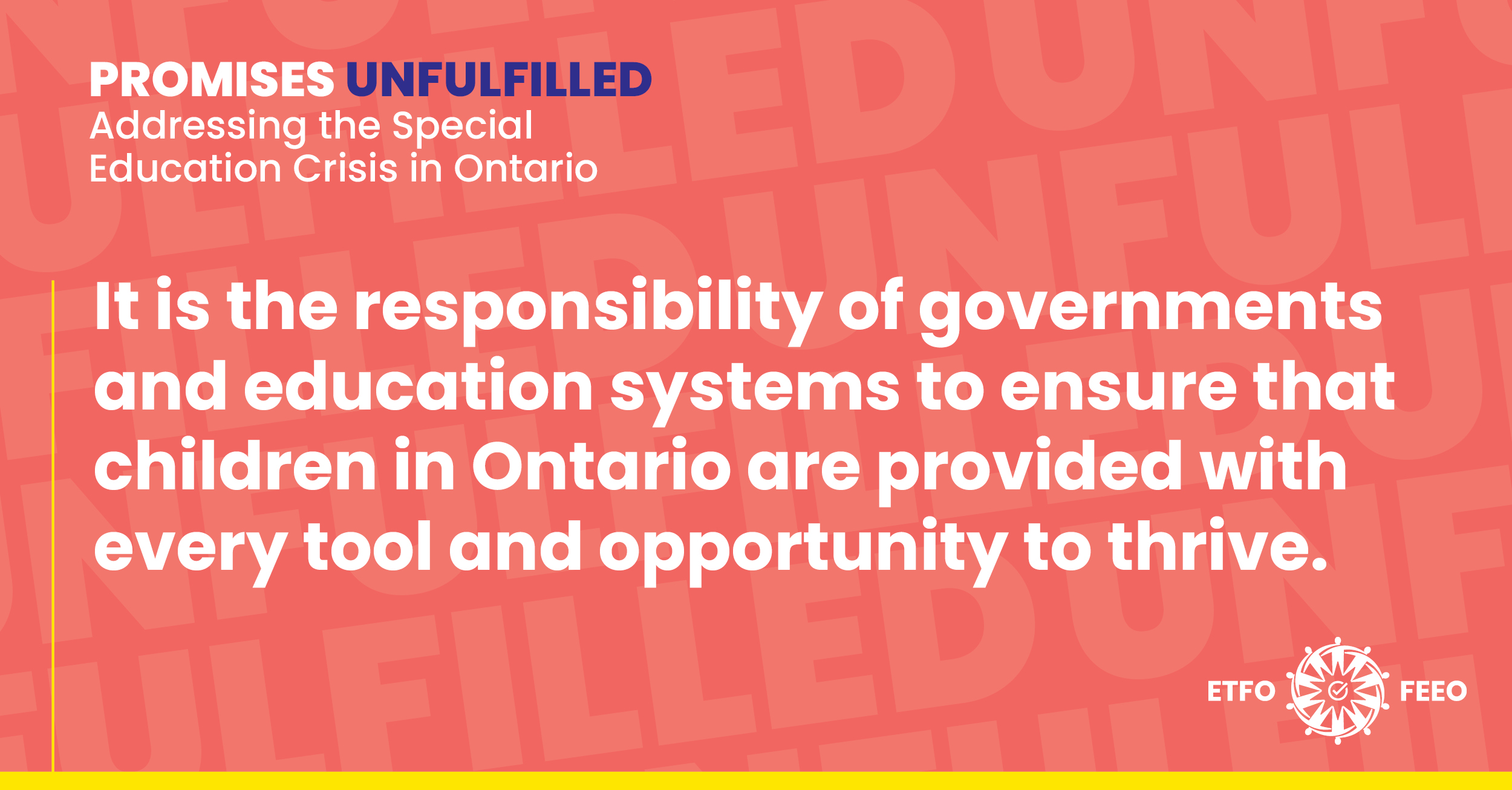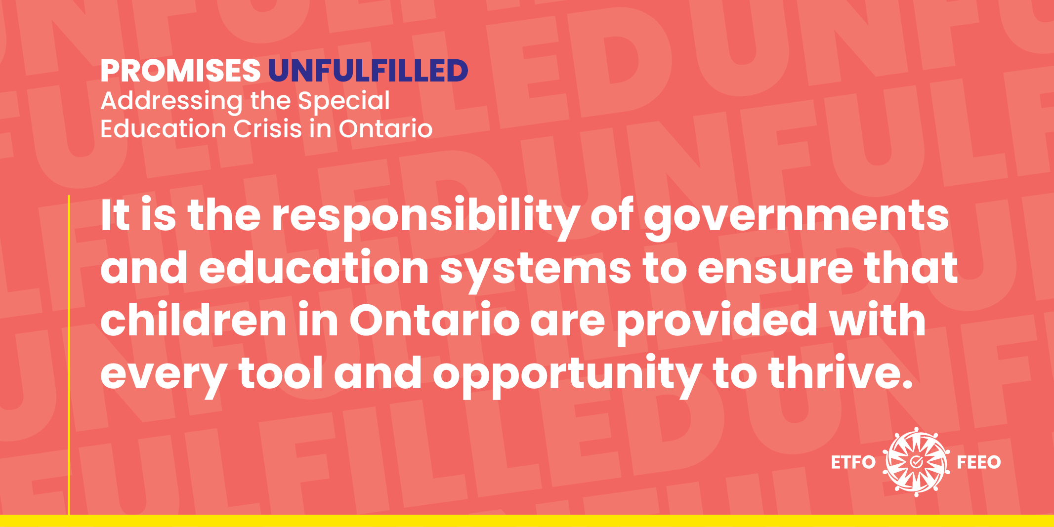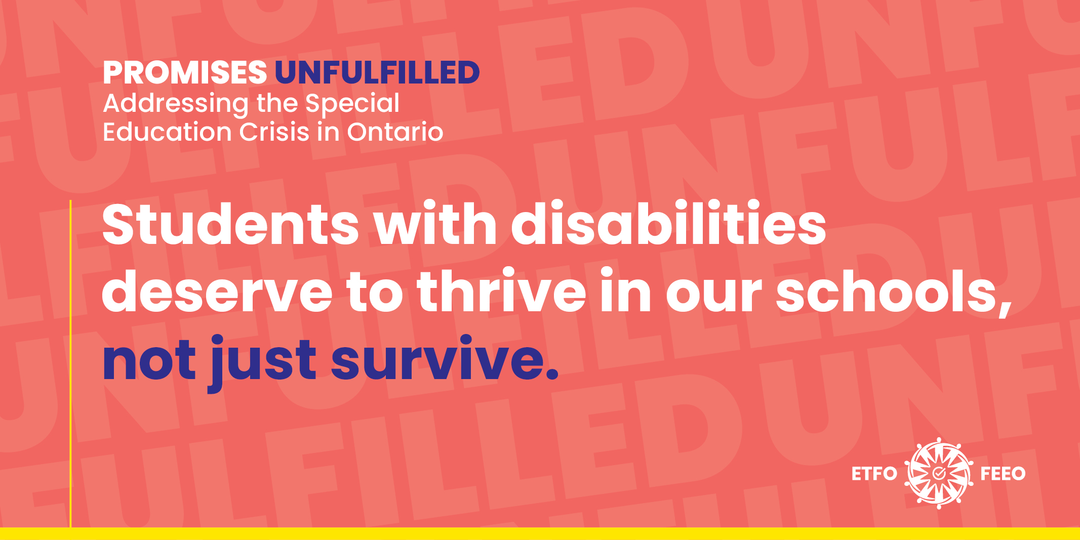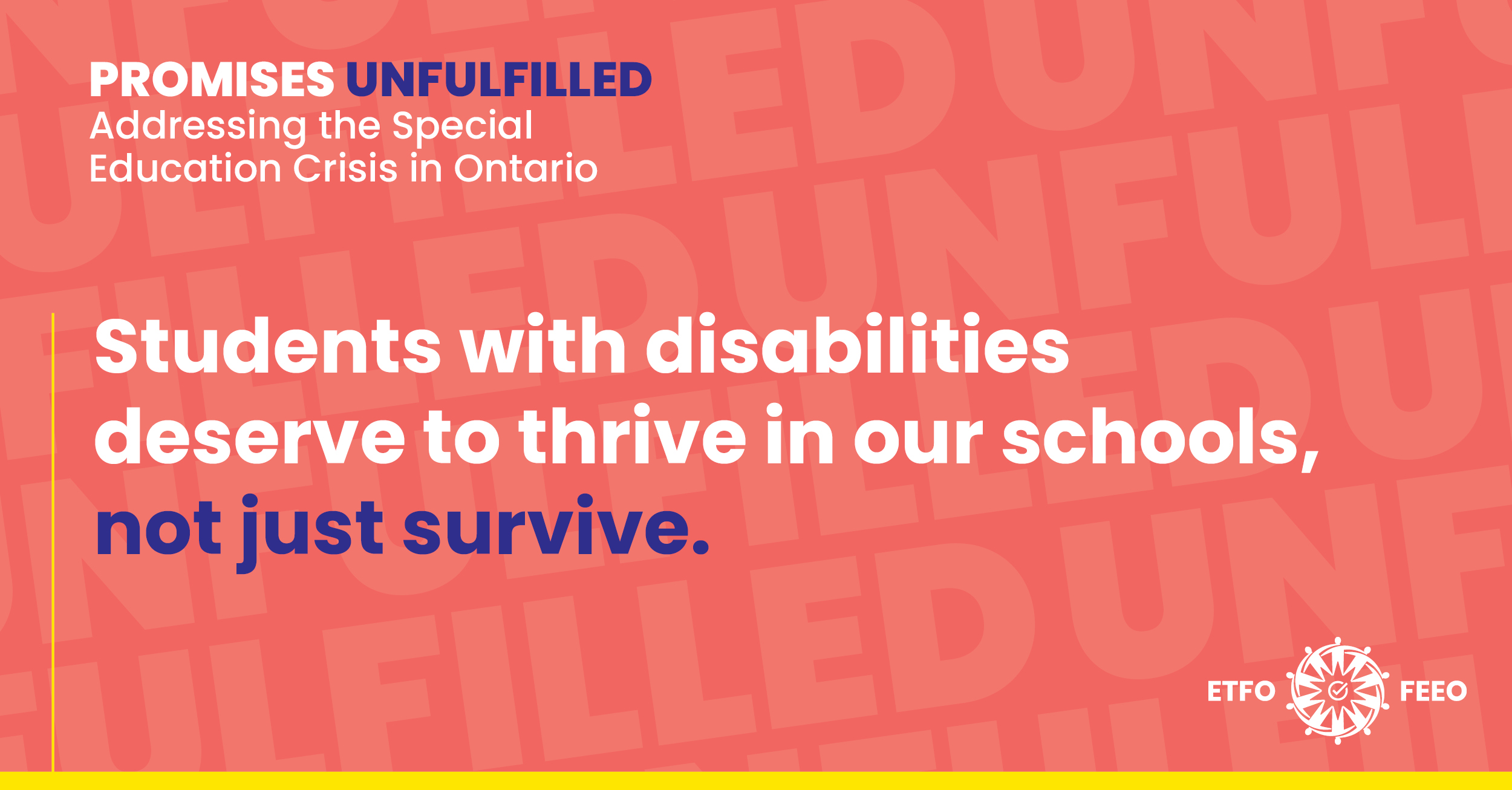 ETFO’s new position paper, Promises Unfulfilled: Addressing the Special Education Crisis in Ontario, serves as a renewed call to action to finally address the shortcomings of a system that is failing children with disabilities in Ontario.