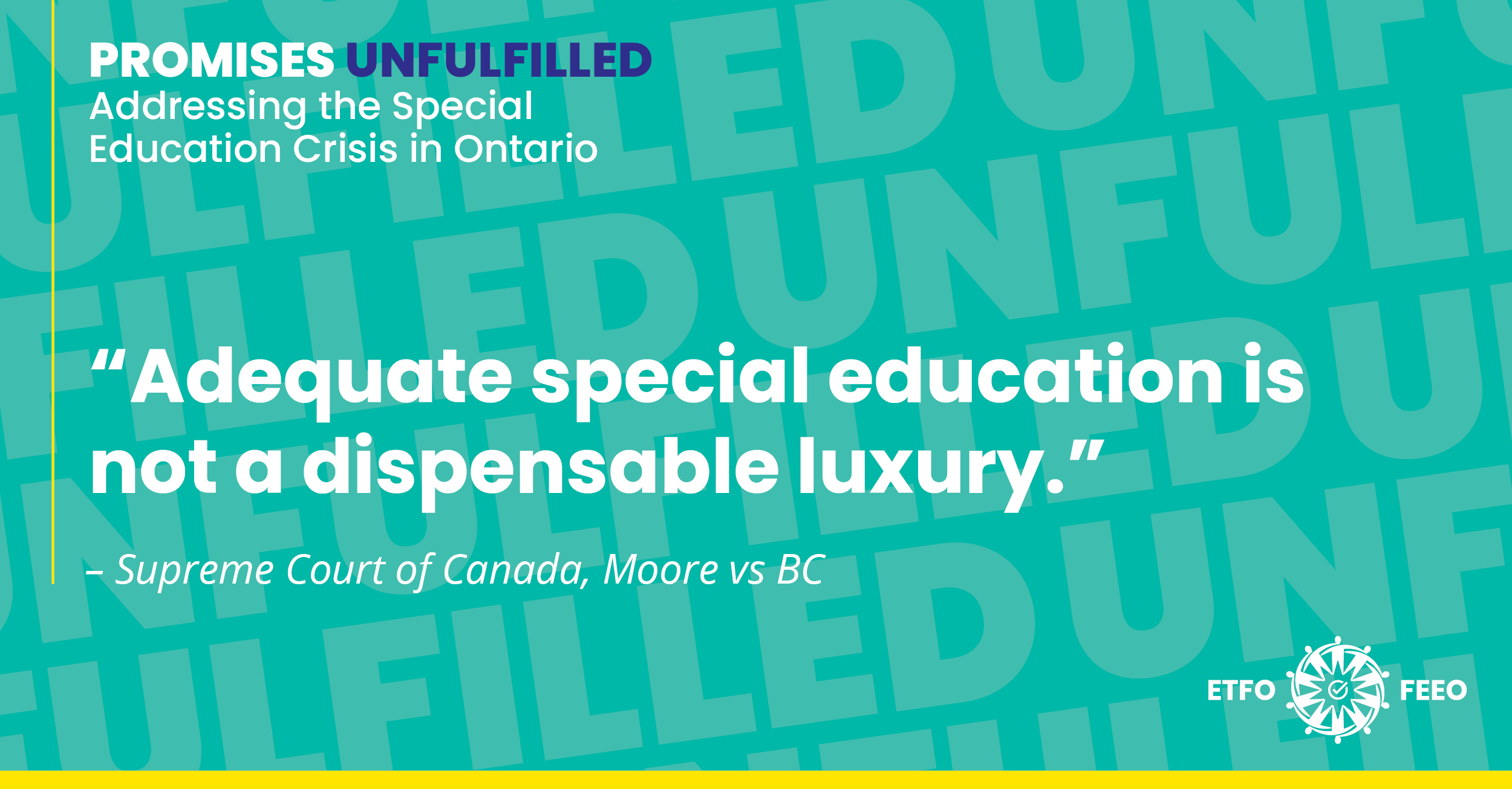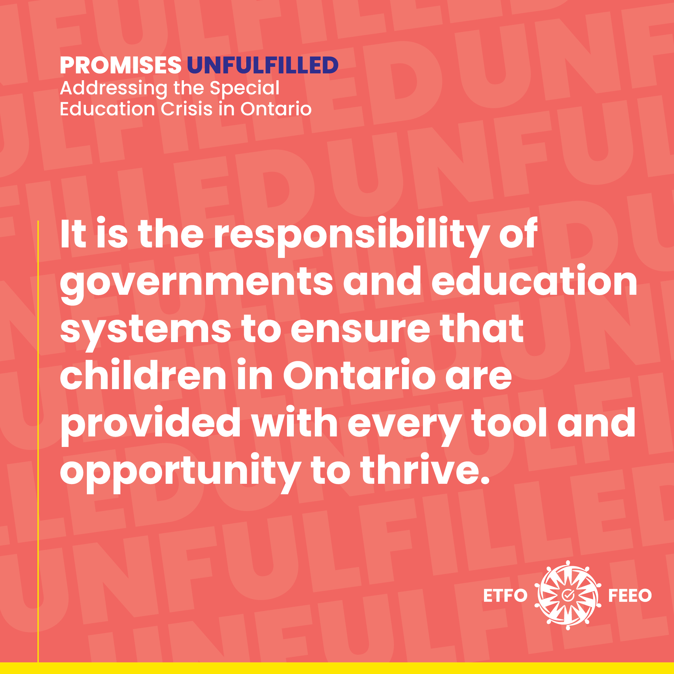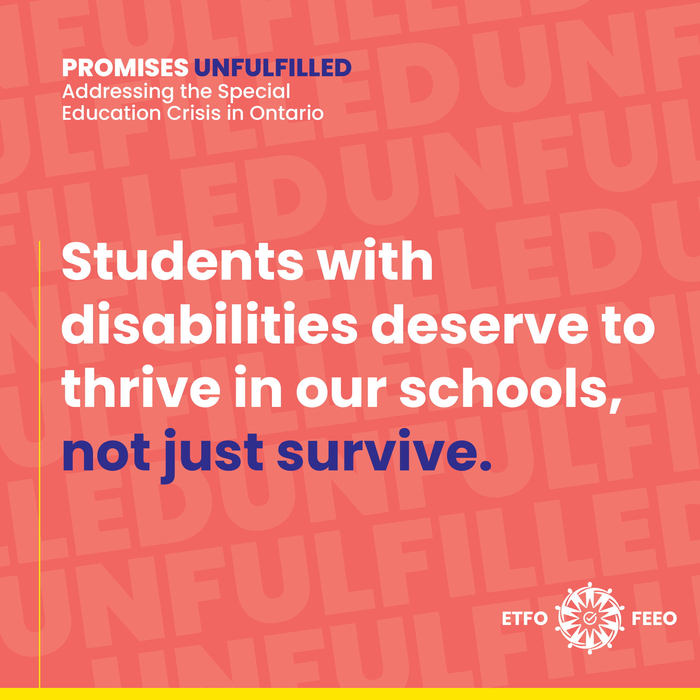 ETFO’s new position paper, Promises Unfulfilled: Addressing the Special Education Crisis in Ontario, serves as a renewed call to action to finally address the shortcomings of a system that is failing children with disabilities in Ontario.