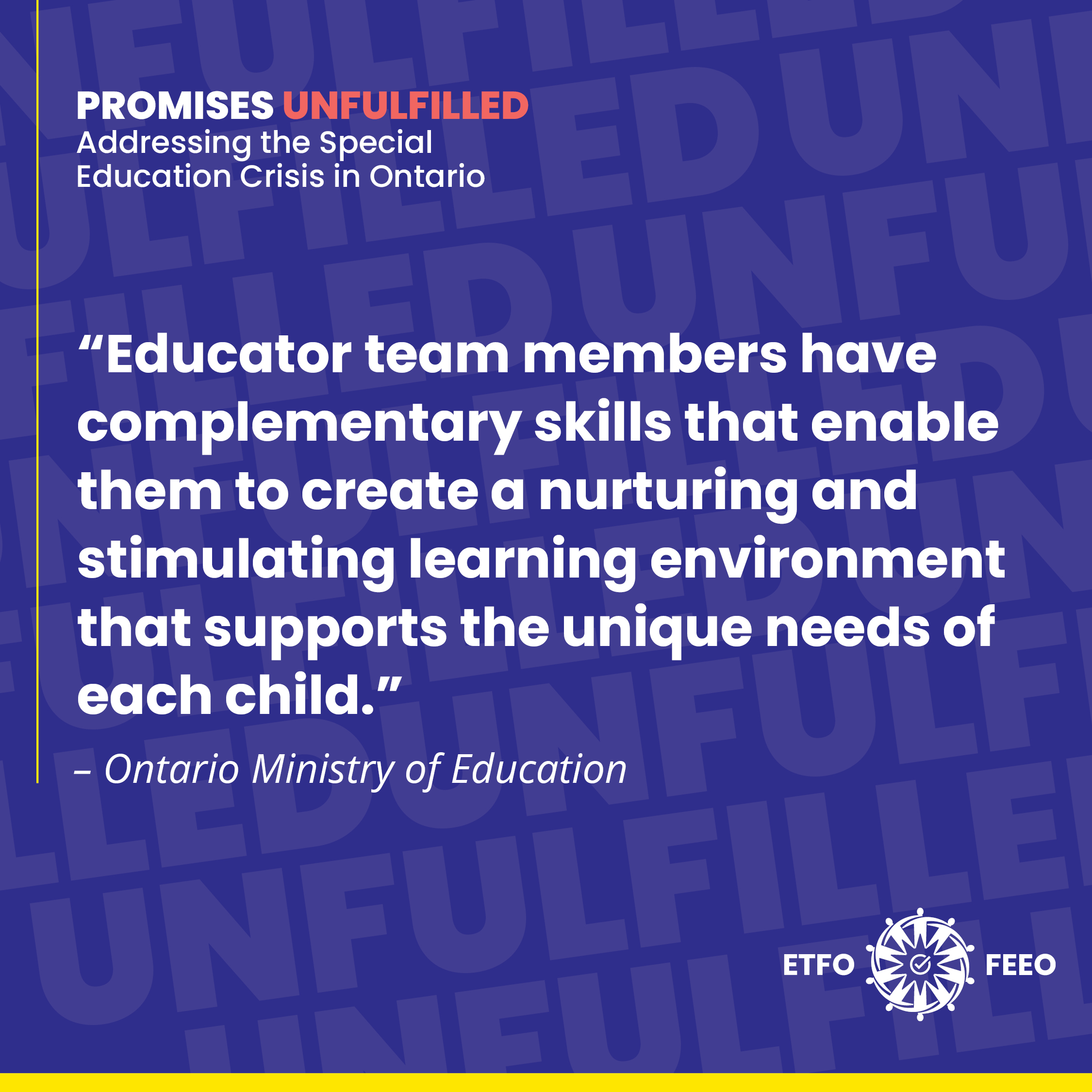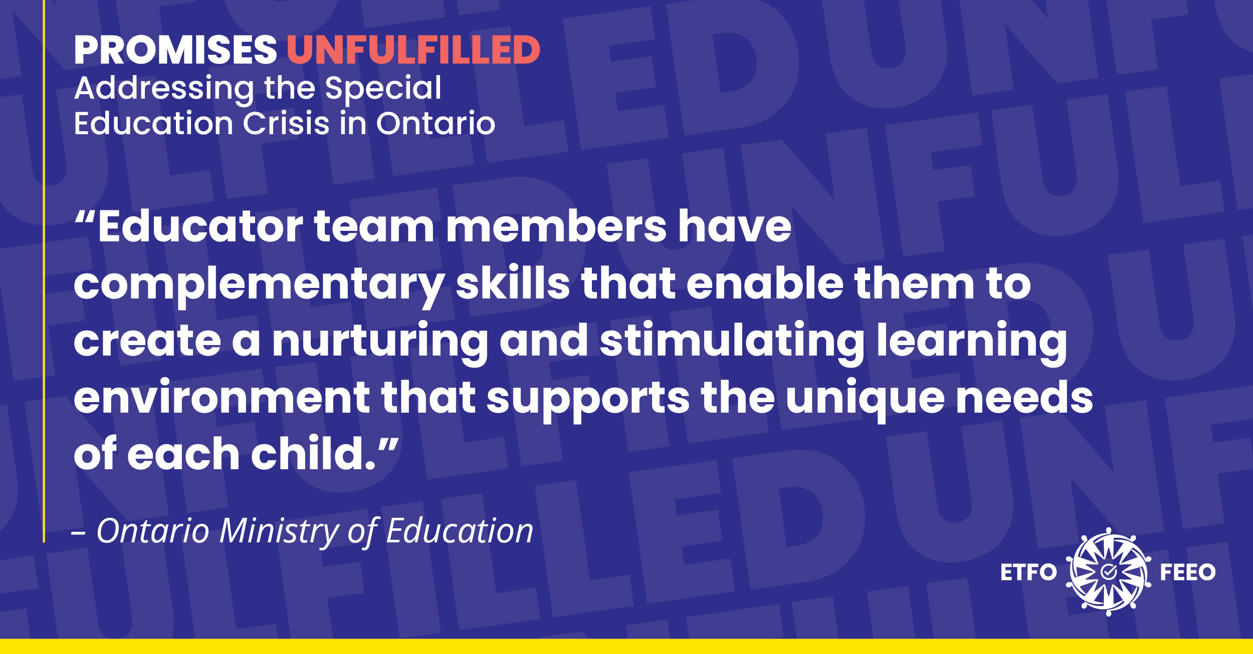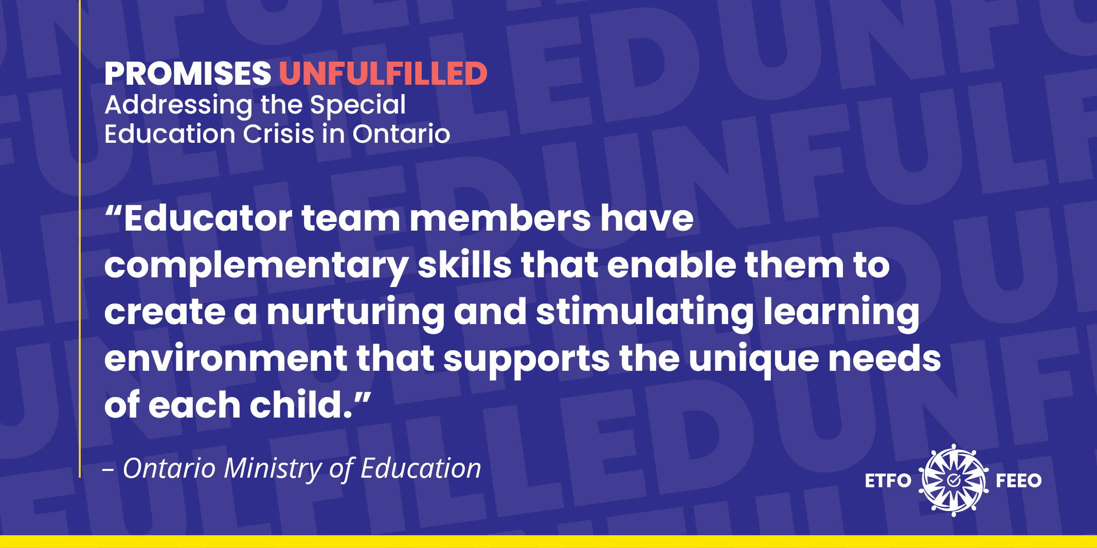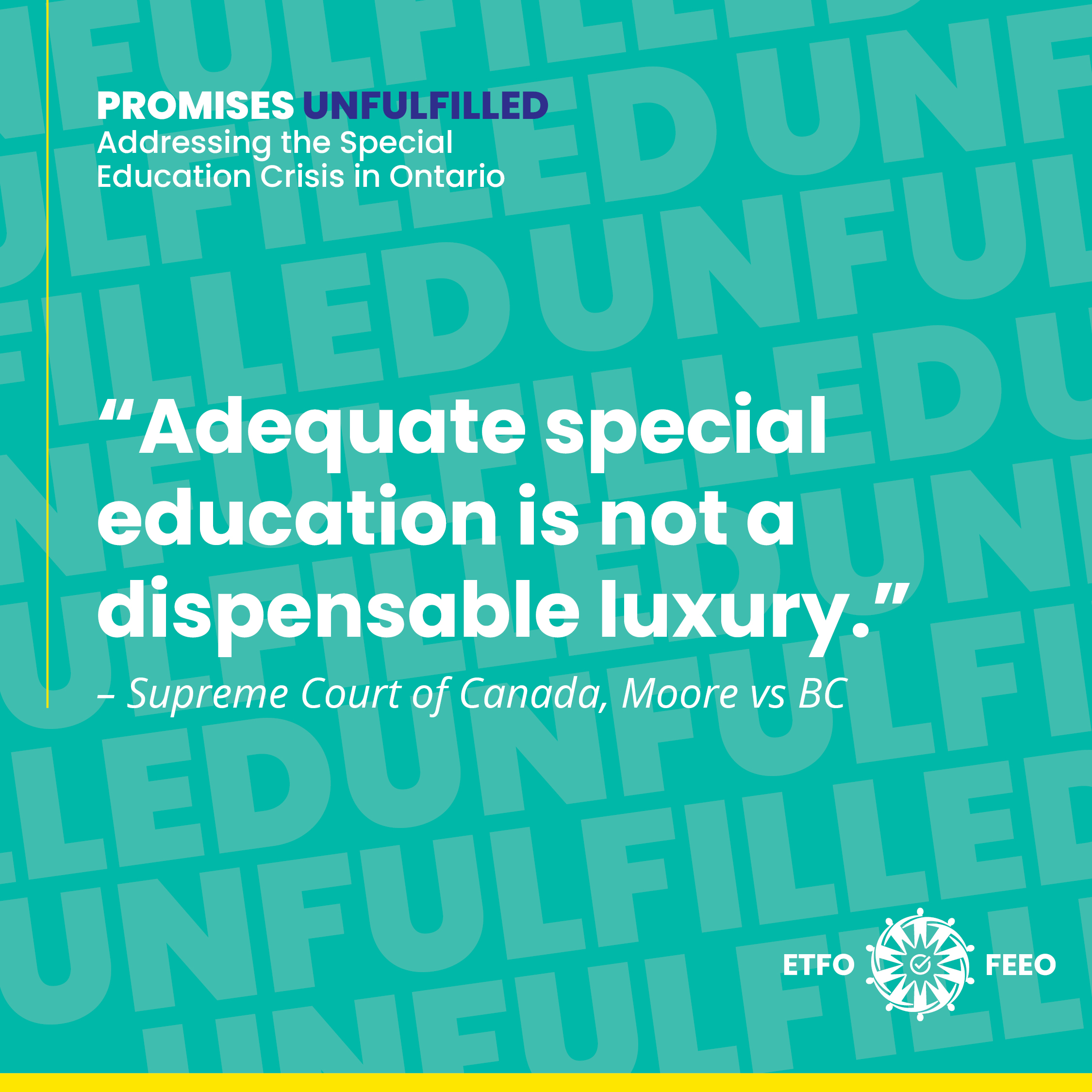ETFO’s new position paper, Promises Unfulfilled: Addressing the Special Education Crisis in Ontario, serves as a renewed call to action to finally address the shortcomings of a system that is failing children with disabilities in Ontario.